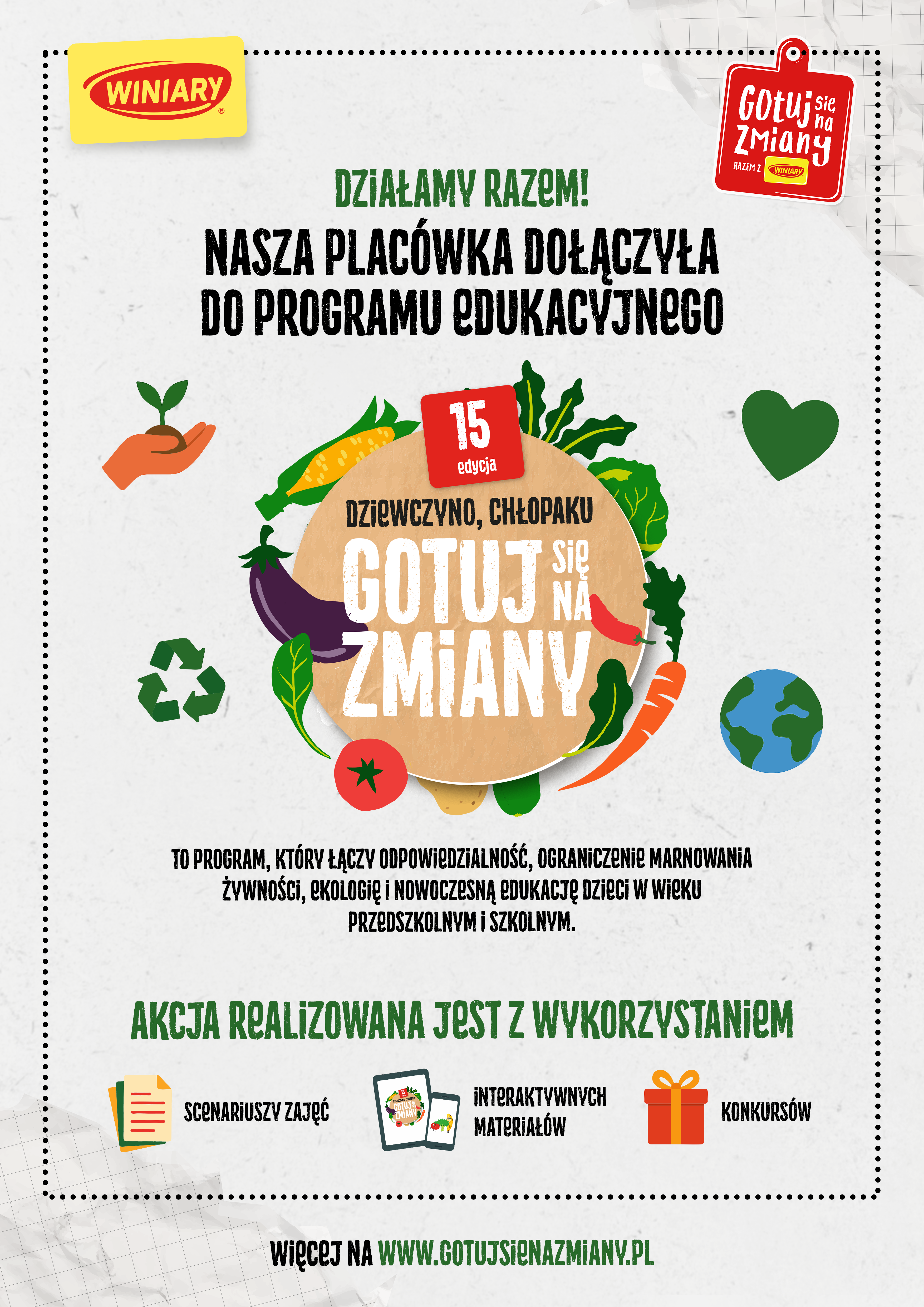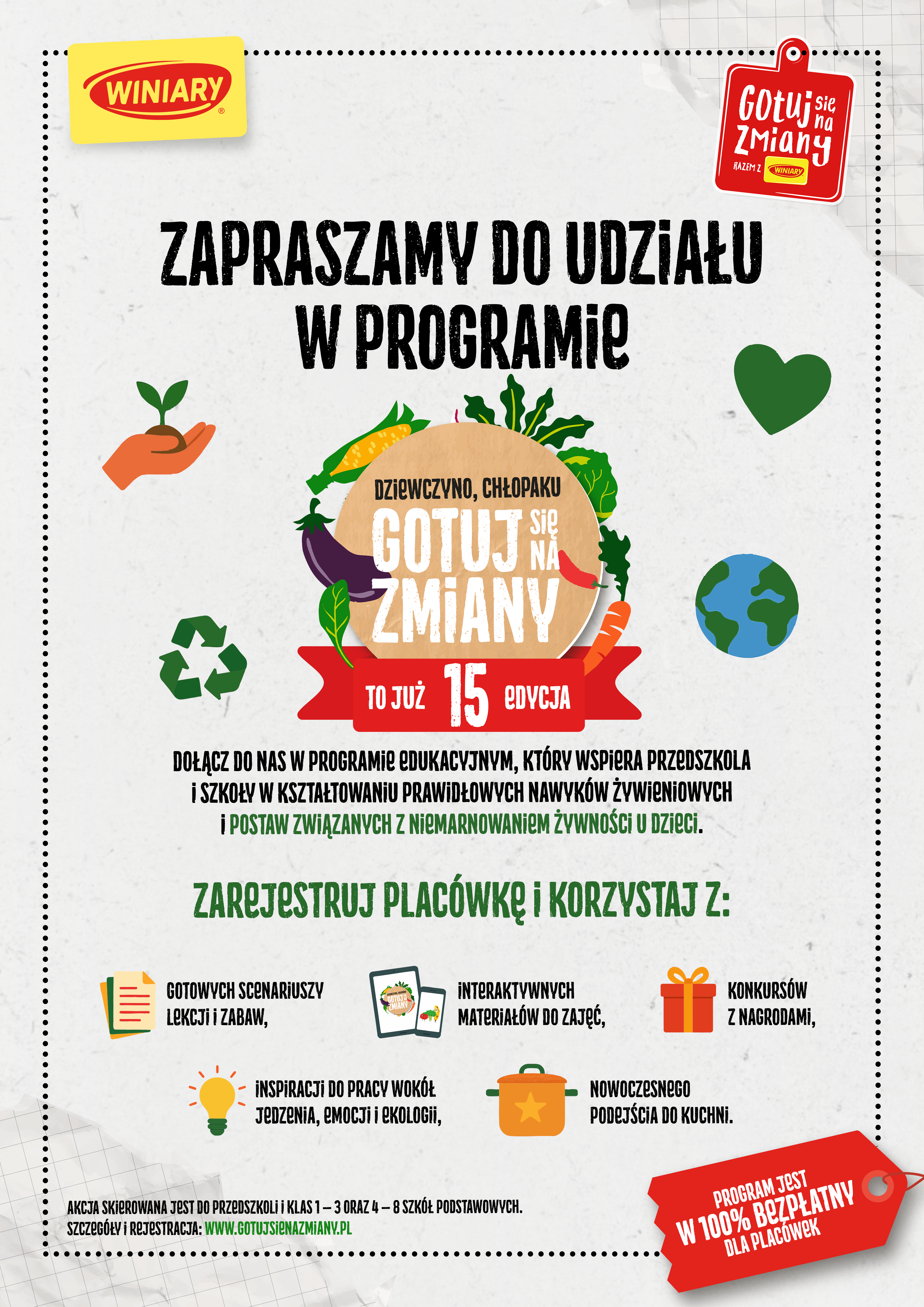 W imieniu NAV Agency Sp. z o.o. uprzejmie zwracam się z prośbą o przekazanie załączonych materiałów informacyjnych podległym Państwu jednostkom oświatowym – przedszkolom oraz szkołom podstawowym – w celu zapoznania się z treścią programu edukacyjnego WINIARY „Gotuj się na zmiany” (edycja 15).